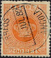 O carimbo do segundo selo da esquerda (imagem de um leilão) está catalogado em (1), está provado que se trata de uma marca falsa. São conhecidos alguns selos tipo coroa obliterados com esta marca, todos de valores diferentes! Da primeira emissão conhecemos os valores de 20r, 200r e 300r, da segunda emissão conhecemos os valores de 10r e 20r.