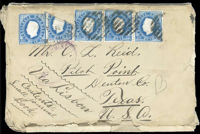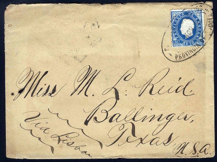 Sobrescrito enviado pelo Eng. Civil J. M. Reid, (Eng. do Caminho de Ferro de Ambaca, cujo diretor era João Burnay) , de Luanda (nov 88) para os Estados Unidos (Texas) onde chegou em 4-Jan-89, com trânsito por Lisboa a 17 Dez-88, com portes de 50 reis.